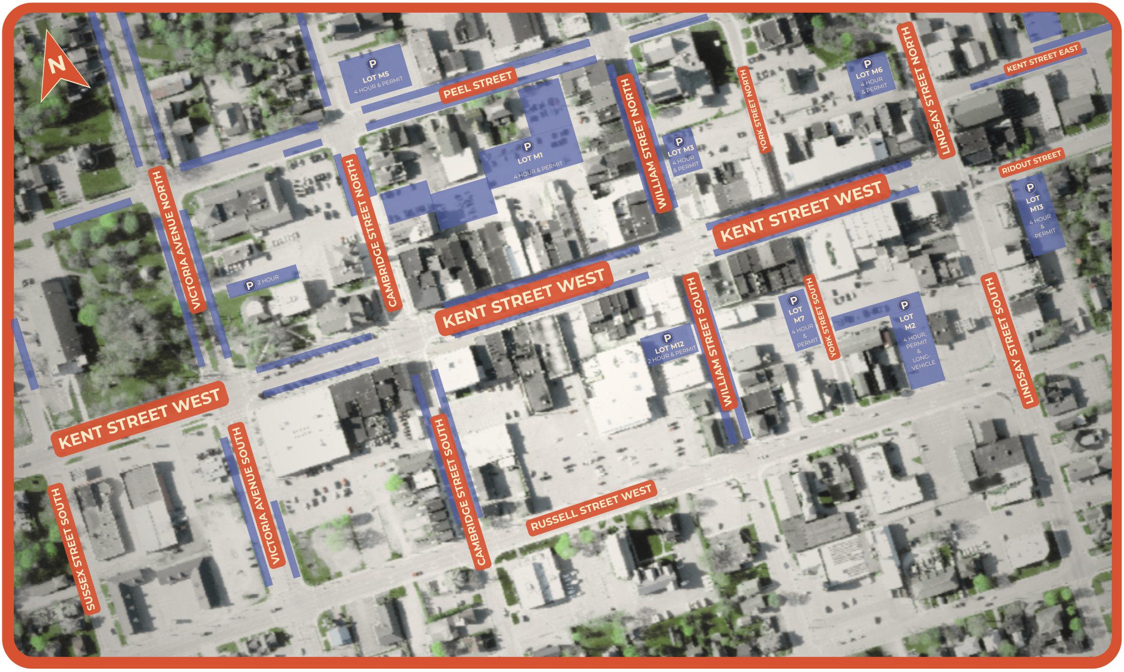 Parking in Lindsay’s Downtown is free of charge within the posted time limits. Typically, on-street parking in the downtown core has a limit of 2 hours, with the municipal lots (highlighted above) having a combination of 2 Hour, 4 Hour or Permit Only parking. The attached map is to be used as a guide only - please be mindful of the posted limits and signage when parking in these areas.